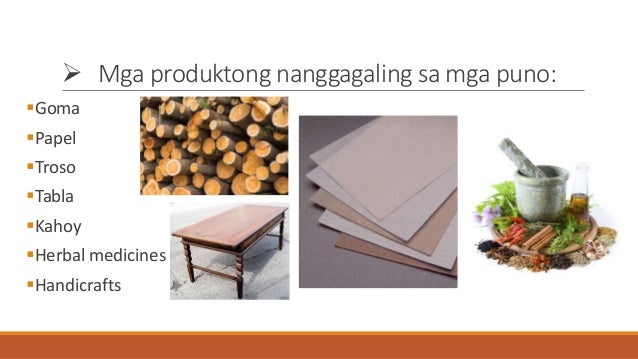 Maraming dolyar ang naipapasok ng mga produkto mula sa kagubatan tulad ng troso kahoy dagta o katas na ginagamit na panangkap sa mga gamot pabango pomada at langis ng buhok. - pinagmumulan ng lahat ng mga hilaw na materyal - tumutukoy sa lugar na pinagtatayuan ng mga pagawaan ng produksyon. All rights deserved yung nakalagay.